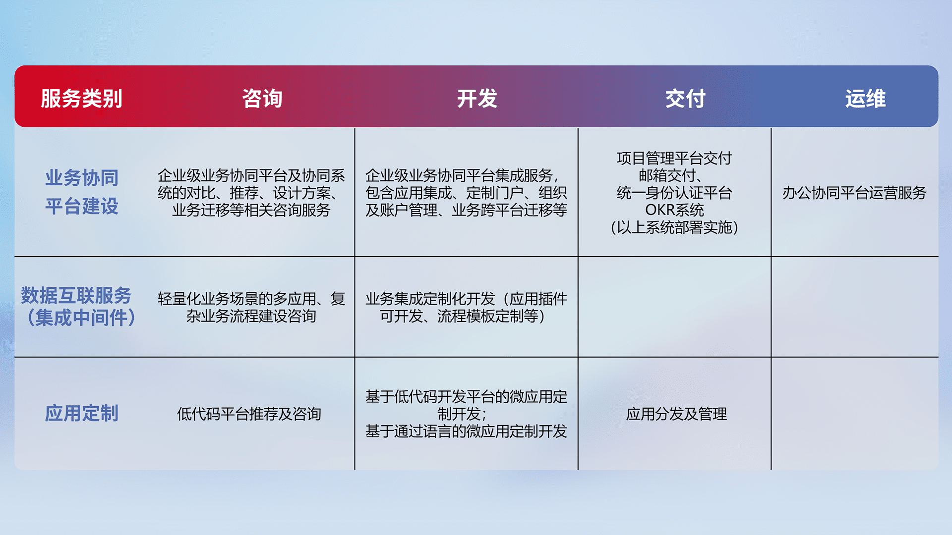 针对钉钉、、、企微、、、IDaas等平台级产品提供产品的规划、、方案、、交付、、、、定制化开发等服务,,实现如统一协同办公、、、、智能客户服务、、、、混合会议管理、、、智能数据查询、、、等业务场景,,,实现数字化转型。。。。
